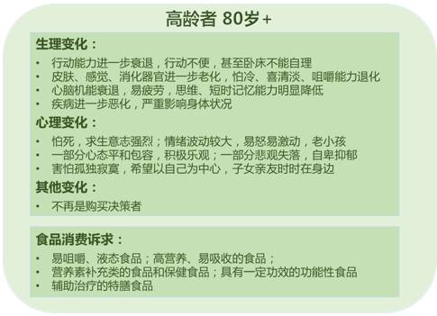 “高齡者”是指80歲以上的人群,“高齡者”由于身體機能的不斷衰退老化,其消費需求的性別差異越來越小。相比“從老者”,“高齡者”行動能力更為受限,甚至臥床不能自理。肌肉進一步萎縮,容易造成咀嚼吞咽困難。根據(jù)Mintel在2015年4月發(fā)布的關于老年人飲食的報告中指出,因咀嚼困難造成高齡者缺乏維生素B6,B12,葉酸、膳食纖維、鈣和鋅的情況越來越普遍。隨著大腦的衰老,“高齡者”情緒波動較大,出現(xiàn)易怒易激動的“老小孩”行為。他們也比從前更害怕孤獨寂寞,希望子女親友時時在身邊。還有部分高齡者由于患病嚴重,容易產(chǎn)生悲觀心理,認為自己“老而無用”,成為“包袱和累贅”,從而自卑和抑郁,對身體造成極大地危害。